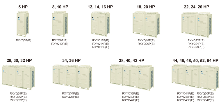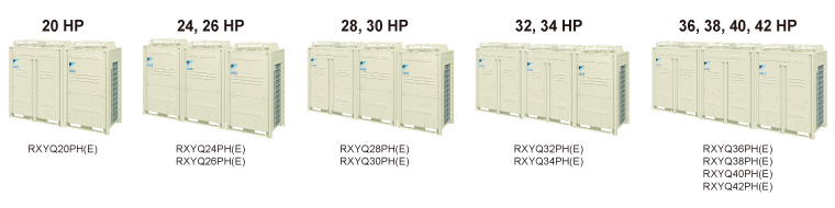 高COP型的室外機可以提供更有效率的性能,有效節省能源,20-42HP機型組合提供更多的用途。