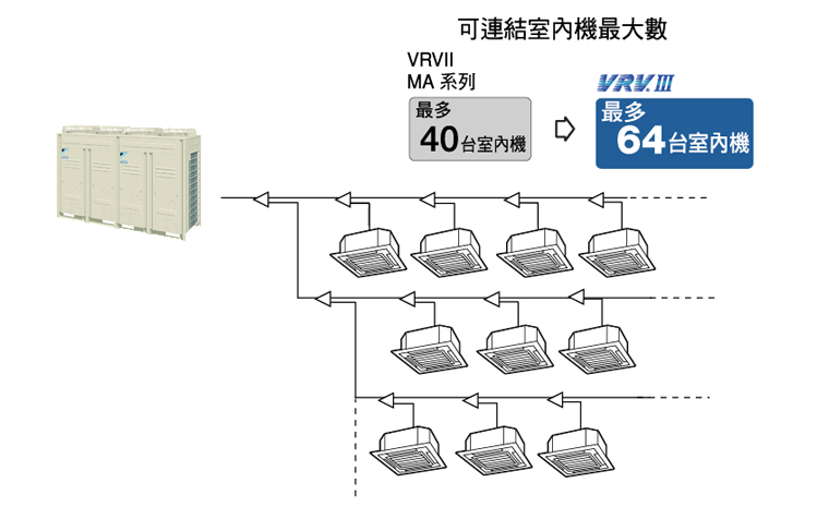 最多可連結至64台室內機。除此之外,室內機款式眾多,包含11型,54個型號,滿足顧客的喜好及需求。