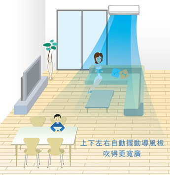一般冷氣只有上下自動擺動的導風板,冷氣吹送的範圍受限;