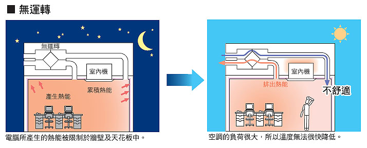 由於辦公室內的辦公設備會提高室內溫度,藉由換氣,可降低白天空調設備的負荷,
