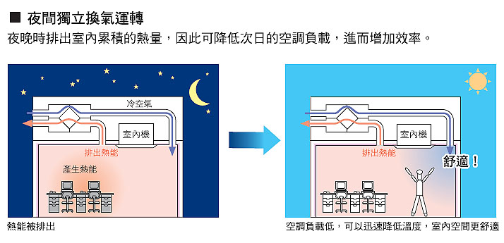 夜間獨立換氣運轉獨立換氣運轉可於夜間空調關閉時運作,以節約能源。
